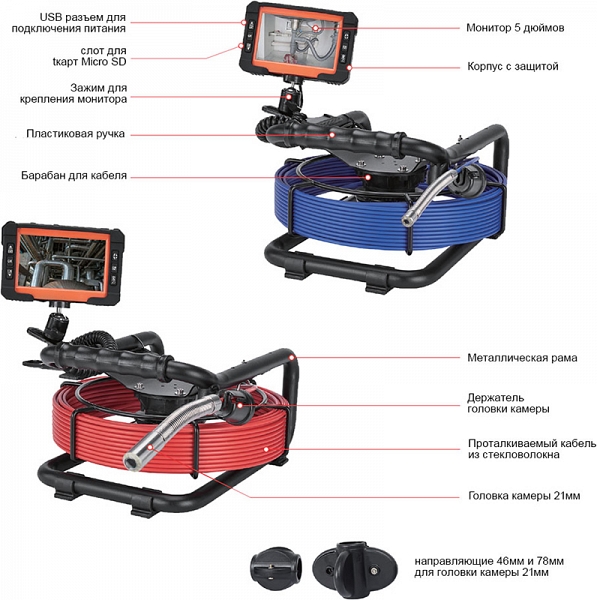 - Головка камеры Ø 21 × 45 мм и проталкиваемый кабель Ø 5,3 мм × 30 м из стекловолокна, подходящие для труб Ø 50 – 125 мм, длиной до 30 м